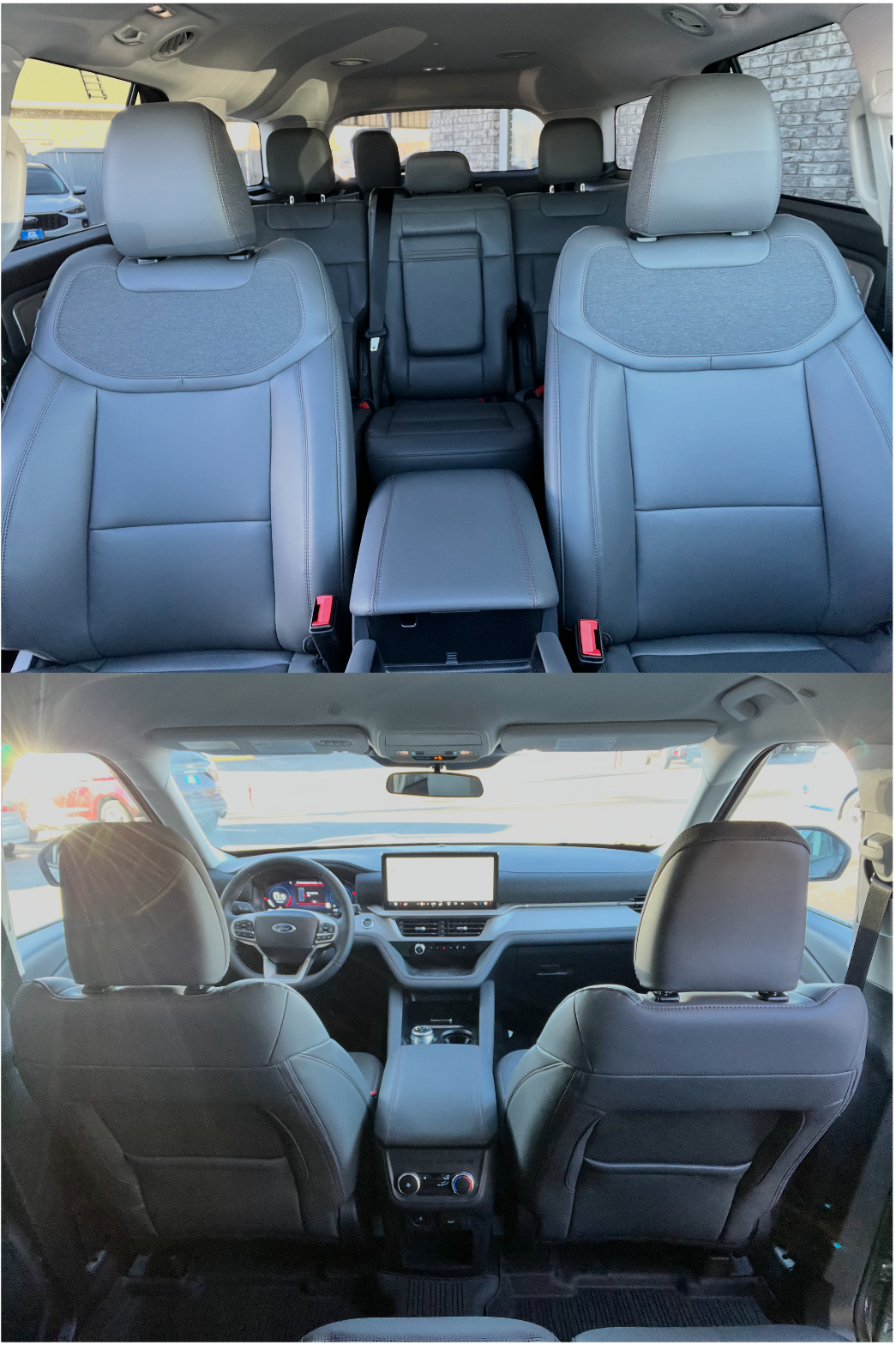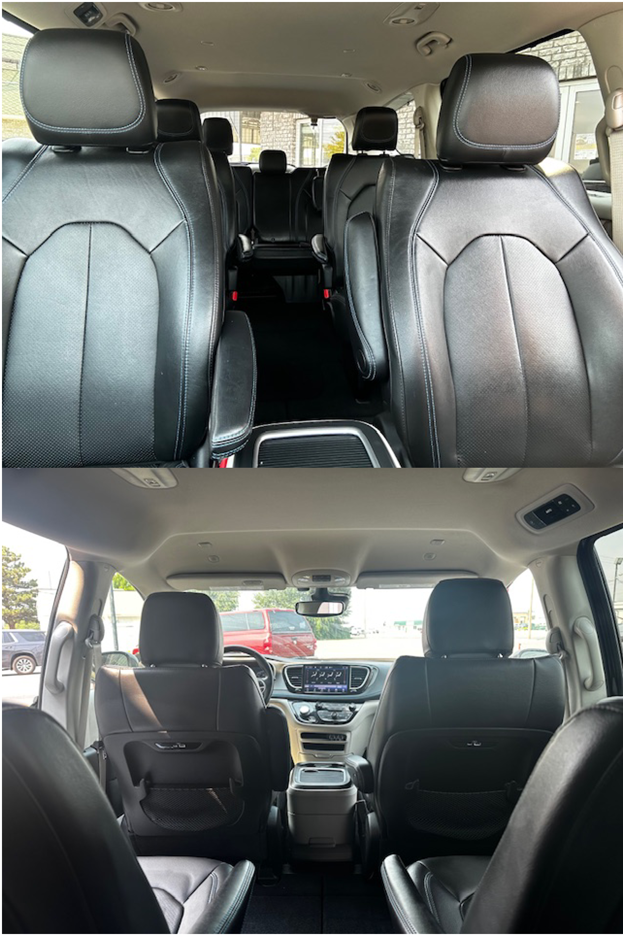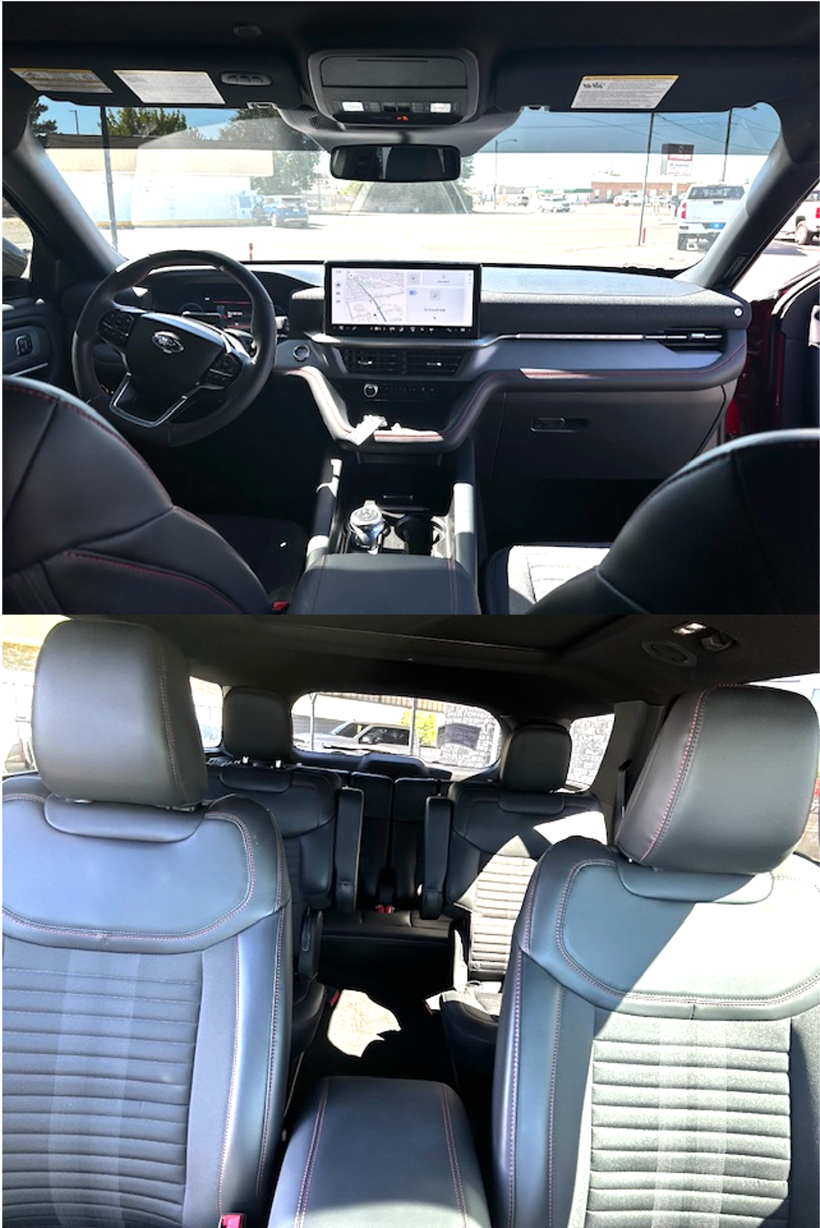 Interior: Leather-trimmed seats with red stitching, spacious three-row layout